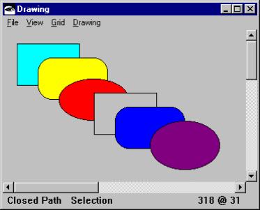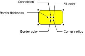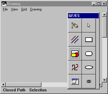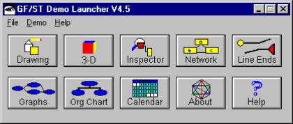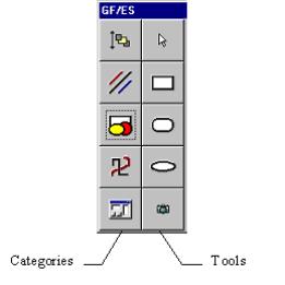 • PsiVisualInspector - A new tool for your toolbox. We expect you’ll start using this inspector instead of the standard ones in Smalltalk, especially since you have them built into it, too.These applications are all well-commented, and we expect you to browse through them to learn how they solve different user interface issued in GF/ST. We’ll be using them extensively in the How To's to refer to specific chunks of code.For completeness, we’ll include a description of how to use each of the major demonstration applications. In them, we’ll explain the basics of what a GFHandle looks like, and so on. You may find it easier just to open them up and use them, and then refer back to the appropriate discussion in the manual when you need to. The exception to this approach is the Visual Inspector. There is a lot of functionality built into the Visual Inspector which you may discover by playing with it, but which might be easier to read about. For example, you can assign objects into instance variables using the connection handles, but it’s not obvious from looking at it. For details on using the Visual Inspector, refer toAppendix A - The Visual InspectorProbably the most important learning-by-example tool we provide for people starting out is the Network Editor. It is a simple application, it’s easy to understand what it’s doing, and it illustrates all the basic concepts you need to know to get up and going. It forms the basis of an entire chapter: GF/ST Application Design & Decisionmaking.The three buttons on the upper left open the Drawing Editor, the 3D Figures Demo and the Visual Inspector respectively. The next few buttons open additional demos that may or may not exist in your environement depending upon what you have loaded. The last two buttons opens the About Dialog and Help file for GF/ST, or for the runtime demo if you are in runtime. On-line Help is only available under Windows.In VA Smalltalk, the GFDemoLauncher was built as a subclass of GFApplicationWindowES (a subclass of WbApplication). It follows a generic approach for opening a GF/ST application, which is described in detail for the Network Editor (see Creating and Opening the Network Editor U). The specific methods for the GFDemoLauncher are:There is a main window to draw-in, labeled Drawing, and a floating palette window. The items on the left of the palette are used to choose the category of tool you are using.When you select an item on the left, the tools available in that category update. You always have a selection tool available at the top no matter what category you choose. Note that as you select categories and tools in the palette, the status pane at the bottom of the drawing window updates to let you know what’s going on.The concept of a tool is central to GF/ST, as is the concept of handle. For an overview of the concepts, refer to Basic Concepts and Classes . For details of how you will be using tools and handles in your own application, you can start with the chapter on GF/ST Application Design & Decisionmaking . Right now, we’re trying to concentrate only on how the Drawing Editor behaves without getting hung up in too much detail.Each graphic object on the screen can have its own specialized pop-up menu. You don’t have to select the object to bring up its menu. Just position the cursor over the object and click the right mouse button. Try some of the options to see how they work. Line graphical objects (or more generally, path figures) also have their own pop-up menus - you just have to aim well when you pop them up. Check out the different behavior of the various types of graphic objects. Where do these menus come from? They are either inherited, or you can simply use the standard getMenu event to get the menu from anyone you want. See the discussion in How To’s sections Setting the Menu of a GO and Setting the Menu of a Drawing for details of using and disabling menus in GF/ST.Each graphic object can have its own specialized set of handles. To be technically accurate, graphic objects do not know what handles they have - they simply trigger the event #generateHandles, and any object can return the appropriate handles. The Drawing Editor demonstrates the default handles which are provided when the event is not handled.You can use the corner handles to resize a GO. When you select the border width handle, the pixel width of the border is adjusted as you move the mouse vertically. The corner radius handle adjusts the sharpness of the rounded corners. You can connect two graphic objects using the connection handle. Connections are a particularly difficult aspect to deal with generally in a graphical application. When you connect two objects, you’ll find that the line connecting them is another graphical object that is constrained to move with the objects it connects - a GFDependentLineGO. The connecting line has its own pop-up menu, letting you change it from a line to an arrow, or to an orthogonal path. Any, all, or none of these handles may be useful to your application, so we provide powerful ways to choose, display, and otherwise manipulate handles. See the discussion in Specializing Handles in the Network Editor and the “How To’s” for more details.You can select more than one graphic object by holding down the shift key as you select them. Alternatively, you can “rubber-band“ around multiple objects when are using the selection tool. Once you have more than one object selected, you can create a group or a composite using the “group” or “compose” menu options. Grouped objects can only be manipulated as a whole, while composite objects are positionable within the composition area on the screen, and can be moved as a whole. Try them out. It’s easier to see the difference when you play with them.Groups and composites are one of the most powerful tools in GF/ST, since they let you compose arbitrarily complex graphic objects from very basic ones. See Creating a GO in th