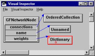 with: (Array with: aGO with: (gos size + 1)).When you click on the right mouse button while the mouse is positioned over a face of the 3-D figure, GF/ST triggers the #getMenu event. The GFThreeDEditor is in turn sent the message #menuForFigureIndex:, the argument for which is an Array with two elements (the first being the polyline GO, and the 2nd being the composite). The menuForFigureIndex: then returns the appropriate application-specific menu.The GFAboutDialog>>open method shows one way to couple the GFOwnDCDrawingPane with the GFDrawingInterface in a window that also has standard subpanes. Refer to that method directly, and see the discussion in Creating the GFNetworkNode GO under :Creating and Opening the Network Editor U in the GF/ST Application Design & Decisionmaking section. for detailed discussion of similar issues in the Network Editor example.You can invoke the Visual Inspector from the GF/ST launcher. The Visual Inspector is a tool that shows the state of objects and the relationships between objects graphically. It is a complex enough tool to warrant a separate chapter in this document (see Appendix A - The Visual Inspector.) Non-source versions of the Visual Inspector are supplied as a freeware on some platforms, which is another reason that we’ve broken out the how-to-use-it documentation from the how-to-understand-it documentation.To open a Visual Inspector on an object, send it the message psiVisualInspect. For example:To flesh out the hierarchy, we initially created three subclasses of PsiAbstractObjectGO - PsiObjectGO, PsiVariableObjectGO (a subclass of PsiObjectGO), and PsiVariableByteObjectGO. These classes were needed to provide different behavior for the three flavors of objects available in Smalltalk. To deal with primitive objects, such as nil, Integer, true, false, and Symbol, we also created a subclass of GFTextGO, PsiPrimitiveObjectGO. To round it all off, we added two more classes under PsiObjectGO - PsiOrderedCollectionGO, and PsiDictionaryGO. Since the base image development environment provides these specialized inspectors, we decided their usefulness would extend into the Visual Inspector as well.Besides being a useful tool for your development, the Visual Inspector is different than the other example applications provided with GF/ST, since it extends the framework. It adds in new GO subclasses and a new handle class. We encourage you to extend the GF/ST framework, and we caution you that, often, your problem can be solved by combining existing GO’s and making use of the events and parameterization that are already present. Refer to GF/ST Application Design & Decisionmaking for more discussion and help in making these kinds of decisions in your own application.