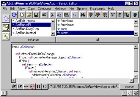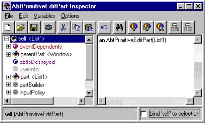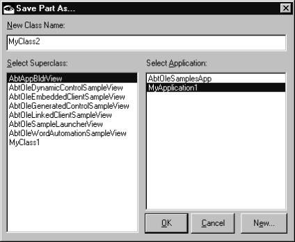 New VAST applications may also be created by clicking on the New... button. The new application will be created with all the proper prerequisites based on the superclass you have chosen.Alt-click to Save As. Opens the Save Part Dialog. This dialog allows you to create new VAST classes and subclass existing ones. Simply select a superclass (AbtAppBldrView by default), specify the target application, enter a class name and click OK. Only applications that have open editions and that you are a group member of will be displayed.New VAST applications may also be created by clicking on the New... button. The new application will be created with all the proper prerequisites based on the superclass you have chosen.Control-click to generate archival code. This is equivalent to the Composition Editor’s “File | Generate archival code” menu command.Select all parts. Right-click for a list of part types. Selecting a part type will select all parts of that type. This is a very useful command when you need to make a style change that affects multiple widgets of a specific type.