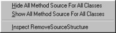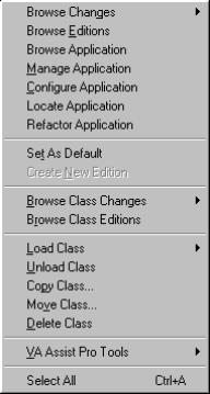Chapter 6 Applications Menu Enhancements Browse Application Now allows you to select one or more applications to browse. This provides a nice intermediate step between opening the standard Applications Browser on all applications and opening an Application Browser on a single application. Manage Application Opens an Application Manager on the selected application. Configure Application Opens an Application Editions Browser on the selected application. Locate Application Locate the Configuration Maps that hold onto the selected application. Refactor Application Opens the Refactory Browser (if present) on the selected application(s). VA Assist Pro Tools Contains several menu items for VA Assist Pro related tools. VA Assist Pro Tools | All Instances | Inspect Opens an inspector on all instances of all the classes in the selected application. VA Assist Pro Tools | Find Hard Coded Strings | In Application Opens a method browser on all methods within the selected application that contain hard coded strings. Thanks to Didier Besset. VA Assist Pro Tools | Find Hard Coded Strings | Include Subapplications Opens a method browser on all methods within the selected application hierarchy that contain hard coded strings. Thanks to Didier Besset. VA Assist Pro Tools | Find Hard Coded Strings | Ignore $NON-NLS$/$NLS$ During a search for hard code strings, ignore any strings that have been flagged with $NON-NLS$ or $NLS$ tags. VA Assist Pro Tools | Find Hard Coded Strings | Ignore Part Names During a search for hard code strings, ignore any strings that are used to designate part names. VA Assist Pro Tools | Find String | In Application Opens a method browser on all methods within the selected application that contain a user specified string. This can be a very time consuming process. A progress dialog is displayed which may be cancelled at any time. VA Assist Pro Tools | Find String | Include Subapplications Opens a method browser on all methods within the selected application hierarchy that contain a user specified string. This can be a very time consuming process. A progress dialog is displayed which may be cancelled at any time. VA Assist Pro Tools | Find String | In System Opens a method browser on all methods within the system that contain a user specified string. This is a very time consuming process. A progress dialog is displayed which may be cancelled at any time. VA Assist Pro Tools | Spell Check | Application Opens a method browser on all methods within the selected application that contain references to misspelled or missing method selectors. This can be a very time consuming process. A progress dialog is displayed which may be cancelled at any time. VA Assist Pro Tools | Spell Check | Including Subapplications Opens a method browser on all methods within the selected class hierarchy that contain references to misspelled or missing method selectors. This can be a very time consuming process. A progress dialog is displayed which may be cancelled at any time. VA Assist Pro Tools | Hide/Show Source Manage the hide/show export status of method source. For each application, the hide/show status may be set for all of its classes. The "Names | Settings | Remove Source" option must be set true for these status settings to have any effect during export. Select All Select all of the applications in the list (which can be painful otherwise for classes like Object). This command also selects all of the categories which makes it easy to view all of the methods defined for a class.